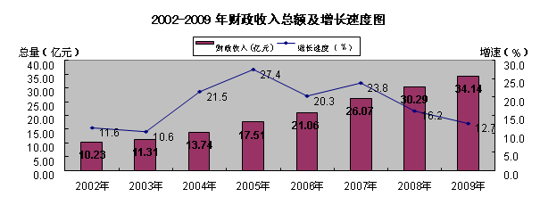 经济运行质量不够理想。2009年,全市财政收入34.14亿元,增长12.7%,财政收入占GDP的比重为11.4%,比上年提高0.2个百分点。财税质量有所下降,财政收入中税收收入21.75亿元,同比下降6.5%,占财政收入的比重为63.7%,比上年下降13.1个百分点。规模以上工业经济效益指数为196.9,同比下降1.9个点;工业企业盈亏相抵后实现利润总额5.07亿元,同比增长73.3%。