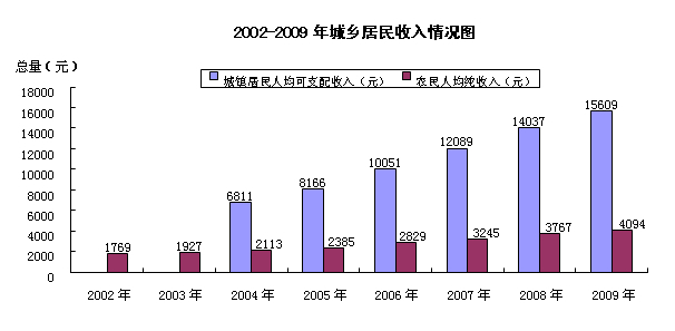 城乡居民收入稳步提高。2009年,城镇在岗职工平均劳动报酬27971元,增长10.1%,城镇居民人均可支配收入15609元,比上年增加1572元,同比增长11.2%,扣除物价上涨因素,实际增长13.6%;人均消费支出10373元,增长6.5%;恩格尔系数(食物支出占生活消费支出的比例)为35.8%,比上年下降3.4个百分点。农民人均纯收入4094元,比上年增加326元,增长8.6%,扣除物价上涨因素,实际增长11.3%。人均消费支出2922元,增长2.6%,其中人均食品消费支出1363元,与上年持平;恩格尔系数为46.6%,下降1.3个百分点。2002年以来城乡居民收入情况见下图: