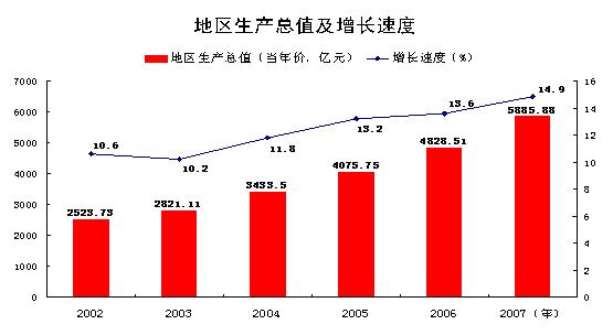 初步核算,全年生产总值(GDP)达到5885.88亿元;比上年增长14.9%,增幅提高1.3个百分点,增速连续6年超过10%,为1995年以来最高水平。GDP年增量首次突破1000亿元,达到1057.37亿元,经济扩张明显加快,综合经济实力进一步提升。分季度看,一季度、二季度、三季度和四季度GDP分别同比增长15.3%、15.0%、14.2%和14.8%,季度增幅波动在1个百分点左右,经济快速运行的持续性和稳健性进一步增强。分产业看,第一产业增加值1264.58亿元,增长5.9%,回落0.6个百分点;第二产业增加值2335.39亿元,增长20.5%,加快1.2个百分点;第三产业增加值2285.91亿元,增长14.2%,加快2.0个百分点。三次产业结构为21.5:39.7:38.8,其中第二产业比重提高0.8个百分点。三次产业对经济增长的贡献率分别为8.3%、53.5%、38.2%。按常住人口计算,全区人均GDP达到12408元,增长13.6%,增幅创1995年以来新高。