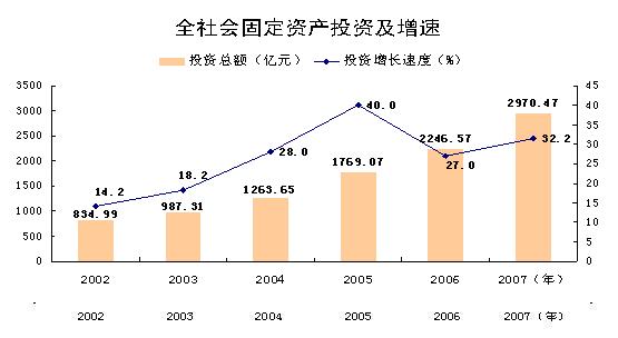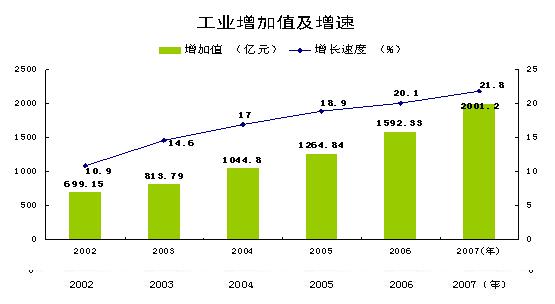 工业生产快速增长,主导地位进一步提升。初步统计,2007年全部工业增加值达到2001.2亿元,比上年增长21.8%,提高1.7个百分点,增幅创1995年以来新高。对经济增长的贡献率达到48%,比上年提高1.4个百分点。规模以上工业完成增加值1430.88亿元,增长26.5%,增幅提高2.6个百分点。其中,重工业增加值958.92亿元,增长27.7%,对规模以上工业贡献率达到67.5%;轻工业增加值471.96亿元,增长24.3%,对规模以上工业的贡献率为32.5%。国有企业完成增加值增长16.4%;集体企业完成增加值增长27.4%;股份制企业完成增加值增长32.5%;股份合作制企业完成增加值增长48.7%;外商及港澳台企业完成增加值增长18.9%;其他经济类型企业完成增加值增长34.5%。全年发电量682.81亿千瓦时,增长30.5%;钢材984.91万吨,增长37.7%;水泥4350.48万吨,增长19.0%;内燃机7609.83万千瓦,增长29.6%;汽车60.48万辆,增长16.6%。工业新产品产值489.09亿元,增长29.9%;出口交货值262.80亿元,增长34.2 %。