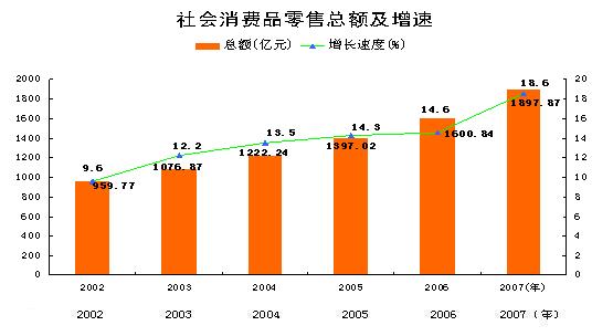 市场销售增长明显加快。初步统计,2007年全区实现社会消费品零售总额1897.87亿元,增长18.6%,为1996年以来最高增速。其中,城市实现零售额1125.91亿元,增长19.3%;农村实现零售额771.96亿元,增长17.5%。批发零售业增长18.9%,住宿餐饮业增长18.7%。私营经济零售额188.51亿元,增长18.8%。食品类、汽车类、石油及制品类等商品销售红火,分别增长30.2%、19.2%和15.5%。