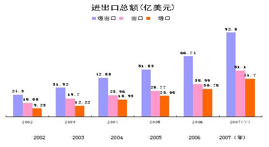 对外贸易快速增长。初步统计,全年进出口总额达到92.8亿美元,增长39.2%,增幅同比提高10.5个百分点。其中出口51.1亿美元,增长42.3%,增幅同比提高17.2个百分点;进口41.7亿美元,增长35.4%。对东盟各国进出口总额29.1亿美元,增长59.2%,其中出口17.3亿美元,增长76.1%。