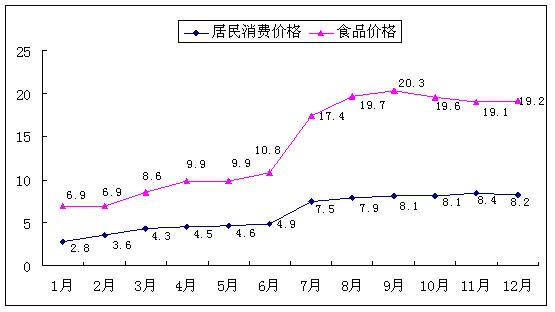 初步统计,全年居民消费价格上涨6.1%,比上年提高4.8个百分点。其中,城市上涨5.6%,农村上涨6.8%,分别提高4.0和5.9个百分点。食品类和居住类价格上涨是拉动价格总水平上涨的主要原因。分类别看,食品类涨幅居首,高达14.1%,其中,粮食类上涨6.4%,油脂类上涨22.3%,食用畜肉及副产品类上涨37.9%、禽类上涨28.6%,蛋类上涨23.8 %;居住类价格上涨5.6%;医疗保健和个人用品类价格上涨3%;衣着类价格上涨2.7%;家庭设备用品及维修服务类价格上涨1.4%;烟酒及用品类价格上涨1.1%;娱乐教育文化用品及服务类价格上涨0.1%;交通和通信类价格下降0.1%。商品零售价格上涨4.8%。工业品出厂价格上涨4.5%,比上年回落5.1个百分点。原材料、燃料、动力购进价格上涨6.1%,比上年回落5.3个百分点。农业生产资料价格上涨14.4%。全区商品房销售价格上涨16.1%。