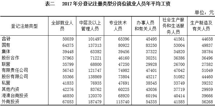 广西区统计局对一套表联网直报平台16个行业门类的约1.7万家规模以上企业法人单位调查显示,2017年全部规模以上企业就业人员年平均工资为50039元,比2016年增长5.1%。其中,中层及以上管理人员101497元,增长4.4%;专业技术人员65396 元,增长6.3%;办事人员和有关人员45495元,增长4.0%;社会生产服务和生活服务人员41561元,增长12.9%;生产制造及有关人员44658元,增长3.8%。中层及以上管理人员平均工资最高,是一套表平台全部就业人员平均水平的2.0倍;社会生产服务和生活服务人员平均工资最低,是一套表平台全部就业人员平均水平的83.1%。岗位平均工资最高与最低之比为2.44,比去年回落0.2个百分点。