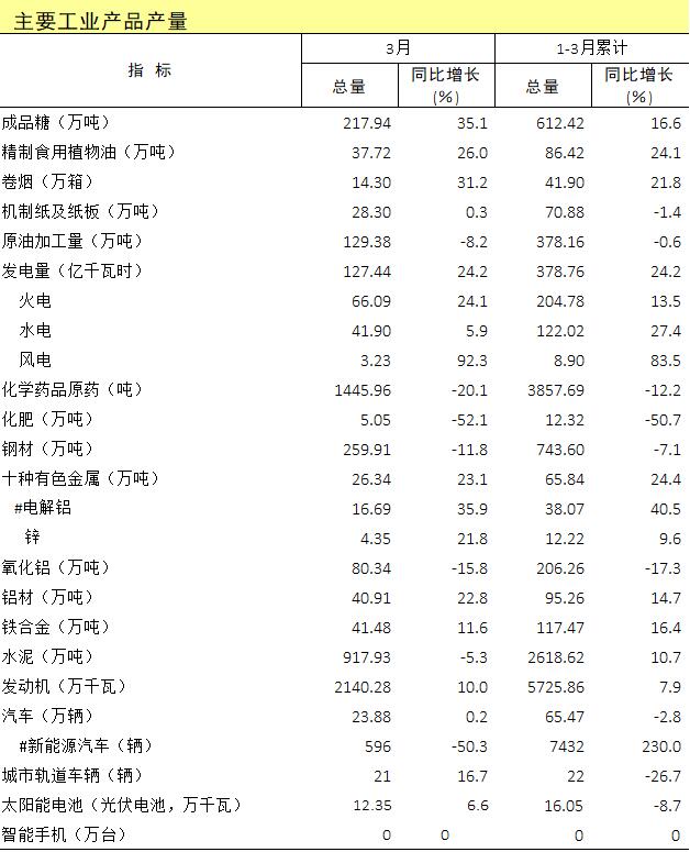 2018年1-3月主要工业产品产量